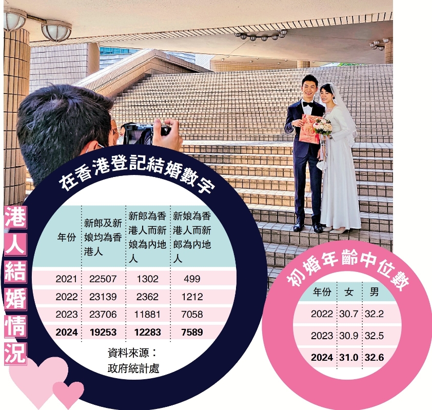 香港特區政府統計處公佈最新統計數字,反映港人婚姻狀況。圖為一對新人在註冊後拍照留念。資料圖片 香港特區政府統計處29日出版《香港的女性及男性─主要統計數字(2025年版)》。在2024年年底,本港有750萬人,當中女性佔409.61萬人,男性為340.45萬人,按年分別減少0.2%及0.6%。2024年是龍年,在龍年效應下,本港去年有36723名嬰兒出生,較2023年增加10.5%,當中19231名是男嬰、17492名是女嬰。 女多男少情況擴大 2024年本港有44196對新人結婚,較2023年結婚宗數減少3527宗。在2024年,女性和男性的粗結婚率(即每千名人口的結婚數目),分別為10.8及12.9,較2023年的11.6及13.9下降。過去三年,男女的初婚年齡中位數持續上升,男子的初婚年齡去年為32.6歲,女子為31歲,均較2023年上升0.1歲。 在香港登記結婚的個案中,新郎及新娘均為香港人的有19253宗,較2023年減少4453宗,並且是自1986年新低、首次跌破2萬宗。 跨境婚姻方面,三年疫情期間數字大減,在2020至2022年間,在香港登記結婚的個案每年有約一千多宗至三千多宗,2023年增至18939,2024年有19872宗。其中,香港新娘與內地新郎結婚的個案,過去兩年增至逾七千宗,2024年錄得7589宗,是自1986年以來的新高。新郎為香港人而新娘為內地人的有12283宗,是自2017年以來的八年新高。 議員:反映兩地融合 香港立法會議員顏汶羽一直有關注港人遲婚問題。他認為,最新統計處數字顯示男女的初婚年齡上升,與近年來香港經濟環境一般、收入不穩定等因素有關,不少適婚青年都在觀望中。不過,由於數字只是輕微上升,他認為情況尚可接受。至於新娘為香港人而新郎為內地人的數字創新高,他認為反映兩地融合,隨著近年來大灣區生活與聯繫越來越緊密,加上政府推動青年灣區創業、學習等措施,更多港人往內地生活、工作、學習,遇到合適的另一半,是值得高興的事情。他認為數字上升是完全合理,也是預期之內的。(來源:香港文匯網) 【編輯:豐悅】