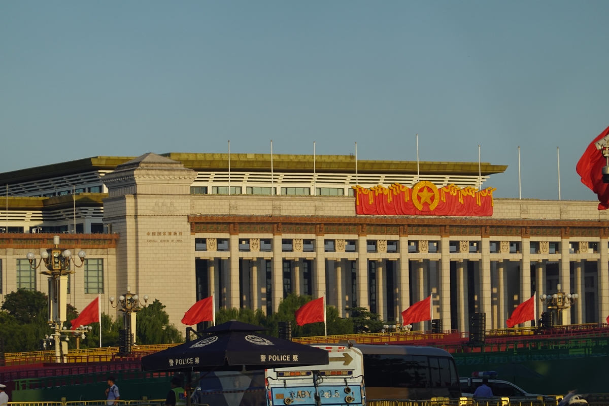 周邊已佈置觀禮台。香港中通社記者 陳卓儀攝 長安街沿線,人民大會堂、北京天安門廣場周邊,都已經佈置了觀禮台,車輛經過時,車內的乘客忍不住伸出手機拍下盛事前的別樣長安街。(完) 【編輯:梁嘉軒】
