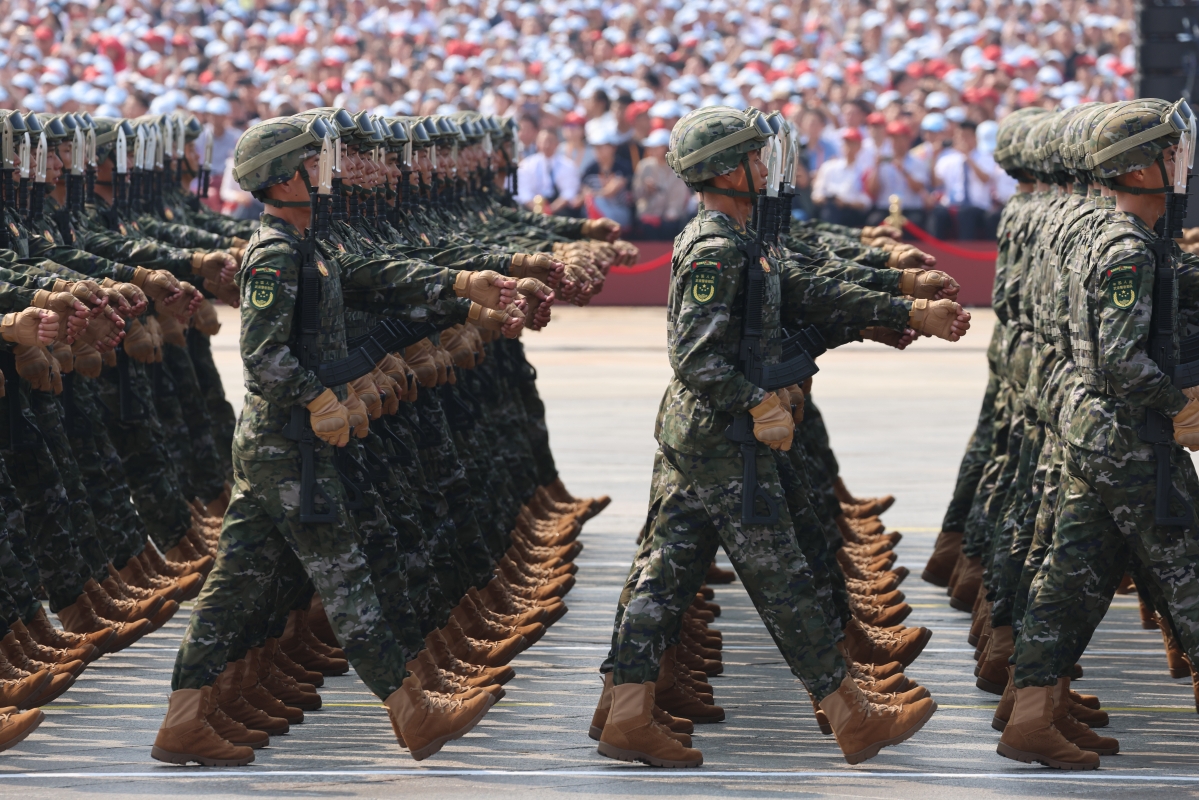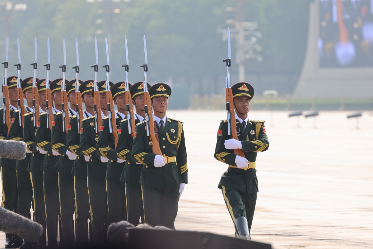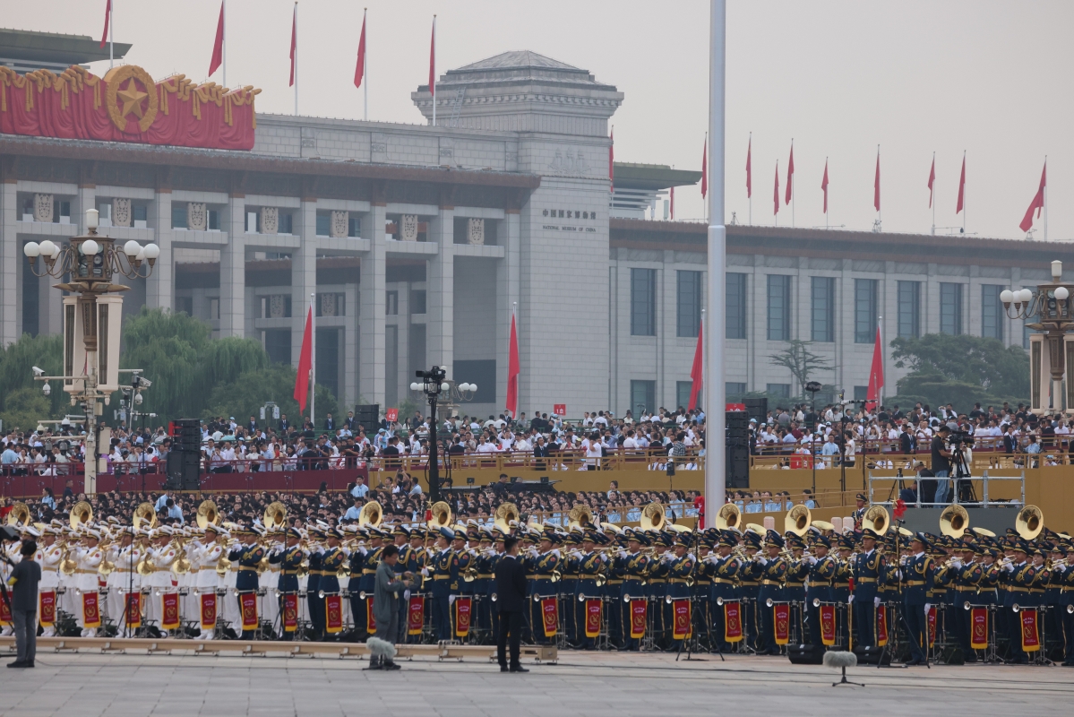 (香港中通社記者 謝光磊攝) 9月3日清晨5時30分許,紀念中國人民抗日戰爭暨世界反法西斯戰爭勝利80週年大會開始前,現場抓緊最後的時間進行綵排。