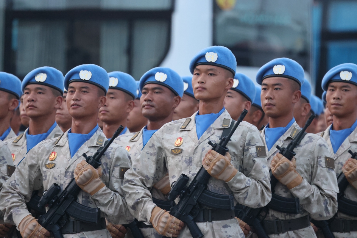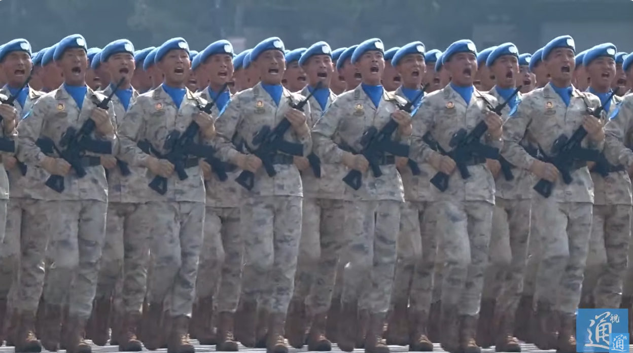 維和部隊方隊。 【北京時間9:20】 受閱部隊在長安街列陣,接受中共中央總書記、國家主席、中央軍委主席習近平的檢閱。雄壯的軍樂聲中,習近平乘車沿著寬闊的長安街,依次檢閱徒步方隊和裝備方隊。受閱部隊軍容嚴整、意氣風發,鐵甲戰車整齊列陣、威風凜凜。檢閱車徐徐前行,官兵的目光緊緊追隨。 “同志們好!”“同志們辛苦了!”習近平的親切問候鼓舞士氣。“主席好!”“為人民服務!”受閱官兵鬥志昂揚,響亮的回答聲震長空。