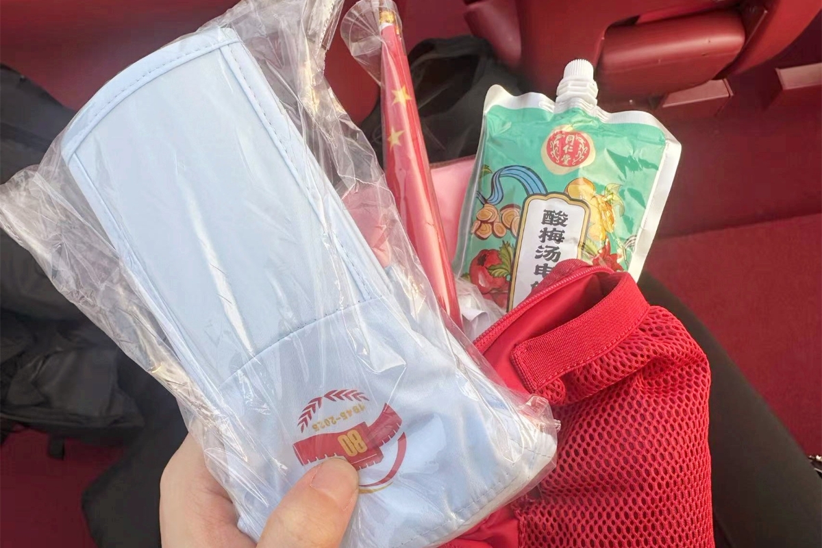 觀禮包內有酸梅湯電解質飲料、紙巾、酒精濕紙、風油精、毛巾、帽子、礦泉水、中國國旗等。