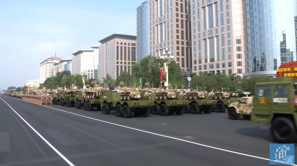 遠程火炮方隊 【北京時間10:10】 地面突擊方隊駛過天安門廣場。陸軍地面突擊力量新一代裝甲裝備100坦克、100支援戰車亮相。