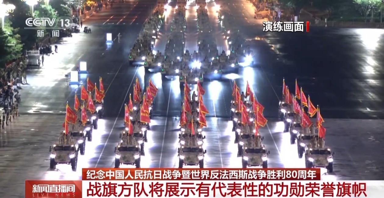 香港新聞網9月3日電 紀念中國人民抗日戰爭暨世界反法西斯戰爭勝利80周年大會今日(3日)舉行。大會包括約70分鐘的盛大閱兵。旗幟引領方向,旗幟凝聚力量。在今天的閱兵活動上,在黨旗、國旗、軍旗引領下,受閱方隊將擎軍旗和武警部隊旗集中亮相,戰旗方隊也將展示功勛榮譽旗幟。 本次閱兵,空中護旗梯隊將由多型直升機組成多個編隊,以護衛旗幟、編成字符、懸掛標語等方式,體現在中國共產黨的領導下,國家日益繁榮昌盛,軍隊不斷發展壯大。 儀仗方隊旗手將擎黨旗國旗軍旗帶隊行進