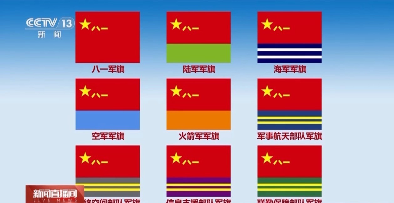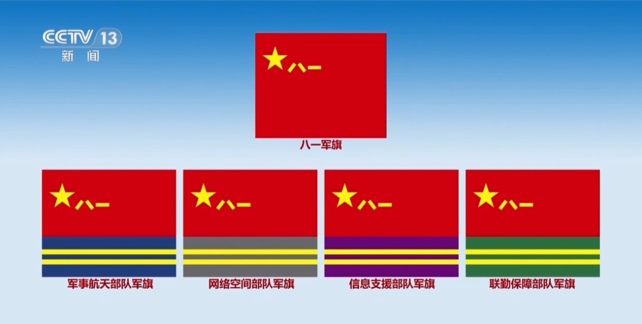 戰旗方隊將展示具有代表性的功勛榮譽旗幟,這些戰旗都是從八路軍、新四軍、東北抗聯、華南游擊隊等授稱(命名)單位中遴選,是我軍在抗日戰爭時期艱苦卓絕戰鬥的縮影。 戰旗的擎旗手都來自相應的功勛榮譽部隊,體現抗戰精神的薪火相傳,體現優良傳統的賡續弘揚。 四兵種、四軍種軍旗將集中亮相 今年7月,中國人民解放軍發佈了軍事航天部隊、網絡空間部隊、信息支援部隊、聯勤保障部隊軍旗旗面式樣。本次閱兵,受閱方隊將擎各自軍旗和武警部隊旗,全方位展示解放軍軍事力量。
