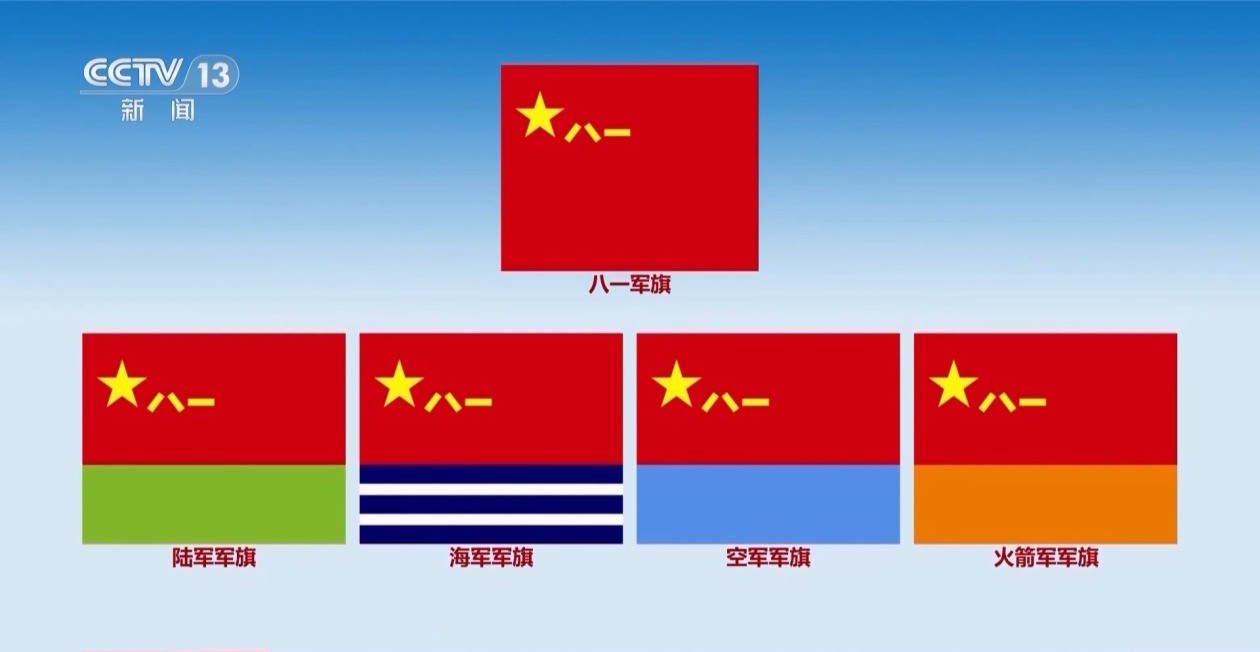 4面軍種軍旗,風格簡潔、大氣莊重。 陸軍軍旗草綠色,象征綠色的大地; 海軍軍旗藍白條相間,象征大海與海浪; 空軍軍旗天藍色,象征遼闊的藍天; 火箭軍軍旗橙黃色,象征導彈點火騰飛時噴出的烈焰。