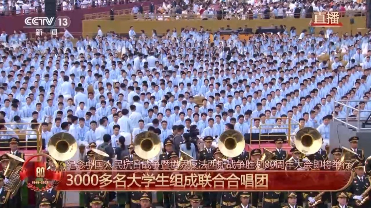 在今天的紀念大會開始前,來自北京40所高校的3000多名大學生組成的聯合合唱團,會在軍樂團的伴奏下連唱多首歌曲——《鬆花江上》《在太行山上》《保衛黃河》等,都是廣為流傳的抗戰經典曲目和具有鮮明時代特征的歌曲,目的就是要帶大家一起重溫抗戰歷史,展現眾志成城的民族精神。