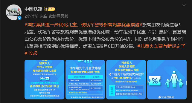 “中國鐵路”微博賬號截圖 據介紹,優惠票價計算基礎從“公布票價”調整為“執行票價”,最低折扣可達公布票價的4折,同時優化兒童票按席別優惠幅度,響應旅客多樣化出行需求,提升特殊群體出行體驗。 根據《鐵路旅客運輸規程》,6至14周歲兒童需購買兒童優惠票;每名持票成年人可免費攜帶一名未滿6周歲且不單獨佔座的兒童,超出一人需購買兒童優惠票;免費兒童單獨佔座時也需購票。 優化後,動車組列車兒童票按席別執行差異化優惠:二等座、一等座按執行票價5折計價,特等座、優選一等座、商務座按8折計價,動車組臥鋪(包括二等臥、一等臥、動臥、高級動臥等)按7折計價,最低折扣為公布票價的4折,為親子出行提供更多便利。 至於持有殘疾軍人證、傷殘人民警察證或國家綜合性消防救援隊伍殘疾人員證的旅客,可購買動車組列車優待票,各席別均按執行票價5折計價,最低折扣同樣為公布票價的4折。普速列車優惠票的適用範圍和計價規則保持不變。 分析指,此次優化旨在通過“折上折”優惠提升特殊群體出行體驗,繼續關注旅客需求,提升服務品質。(完) 【編輯:彭玉婷】