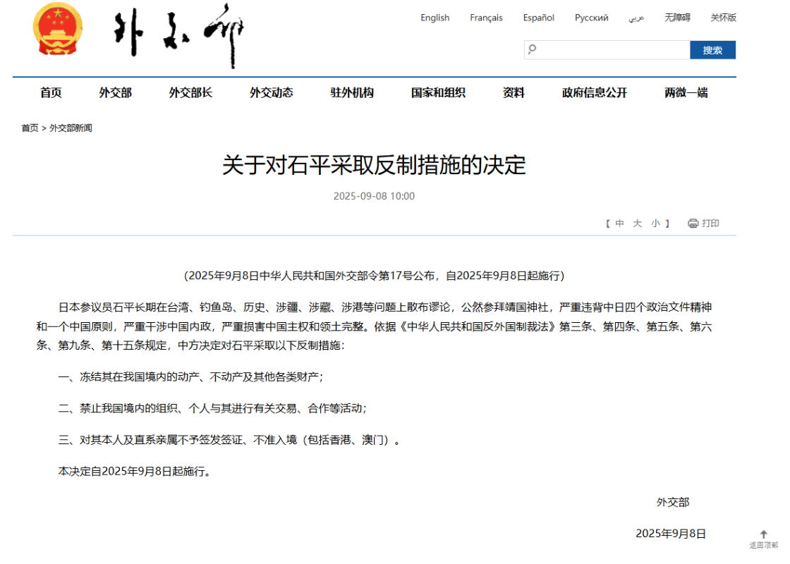 圖源:中國外交部官網截圖 《決定》稱,日本參議員石平長期在台灣、釣魚島、歷史、涉疆、涉藏、涉港等問題上散布謬論,公然參拜靖國神社,嚴重違背中日四個政治文件精神和一個中國原則,嚴重干涉中國內政,嚴重損害中國主權和領土完整。依據《中華人民共和國反外國制裁法》第三條、第四條、第五條、第六條、第九條、第十五條規定,中方決定對石平採取以下反制措施: 一、凍結其在中國境內的動產、不動產及其他各類財產; 二、禁止中國境內的組織、個人與其進行有關交易、合作等活動; 三、對其本人及直系親屬不予簽發簽證、不准入境(包括香港、澳門)。 本決定自2025年9月8日起施行。(完) 【編輯:彭玉婷】