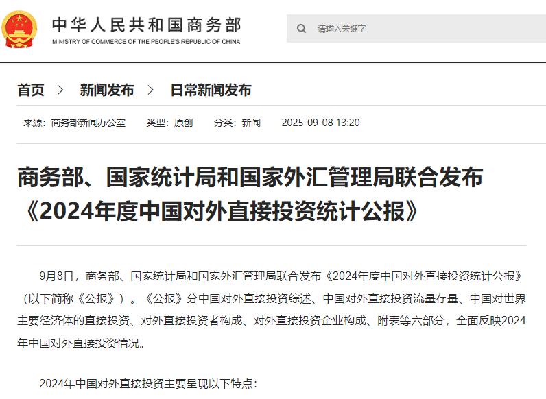 (中國商務部網站截圖) 2024年中國對外直接投資主要呈現以下特點: 投資規模繼續保持世界前列,流量全球佔比提升0.5個百分點。2024年,中國對外直接投資流量1922億美元,比上年增長8.4%,佔全球份額的11.9%,較上年提升0.5個百分點,連續13年列全球前三,連續九年佔全球份額超過一成。2024年末,中國對外直接投資存量3.14萬億美元,連續八年排名全球前三。 境外企業覆蓋全球超過80%的國家和地區,年度經營狀況良好。截至2024年底,中國境內投資者共在全球190個國家和地區設立境外企業5.2萬家,其中,在共建“一帶一路”國家設立境外企業1.9萬家。2024年,境外企業當年收益再投資778.9億美元,佔同期流量的40.5%,七成境外企業盈利或持平。 投資領域持續多元,超八成投向五大領域。2024年,中國對外直接投資涵蓋了國民經濟的18個行業門類,其中流向批發零售、租賃和商務服務、製造、金融、採礦五領域的投資均超過百億美元。對建築業、信息傳輸/軟件和信息技術服務業投資增長較快,增速分別為80.5%、205.5%。 對亞洲、拉丁美洲、歐洲和大洋洲的投資持續增長,對共建“一帶一路”國家直接投資增長超兩成。2024年,中國對外直接投資近八成流向亞洲,比上年增長8.5%,其中對東盟投資343.6億美元,增長36.8%。對拉丁美洲、歐洲、大洋洲投資分別增長15.4%、25.3%和113.7%。2024年,對共建“一帶一路”國家直接投資509.9億美元,比上年增長22.9%,佔當年對外直接投資流量的26.5%。