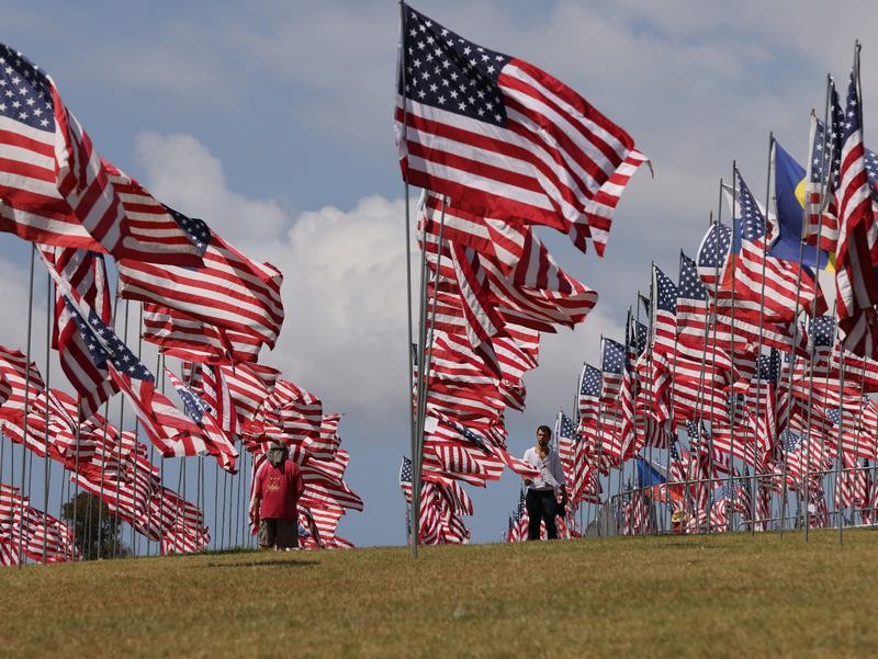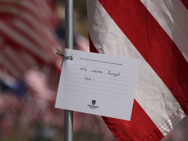 9月10日在美國加利福尼亞州洛杉磯縣馬利布佩珀代因大學拍攝的“旗海”中的悼念留言卡片。新華社照片 在賓夕法尼亞州尚克斯維爾鎮亦有紀念儀式。聯合航空93號客機當年被恐怖分子騎劫,由於乘客反抗而沒有撞向目標,而是在這兒墜毀。 2001年9月11日,基地組織的19名恐怖分子劫持四架民航客機,分別撞向紐約世貿中心雙子塔、五角大樓及在賓夕法尼亞州墜毀,造成近3000人死亡。(完) 【編輯:紀東】