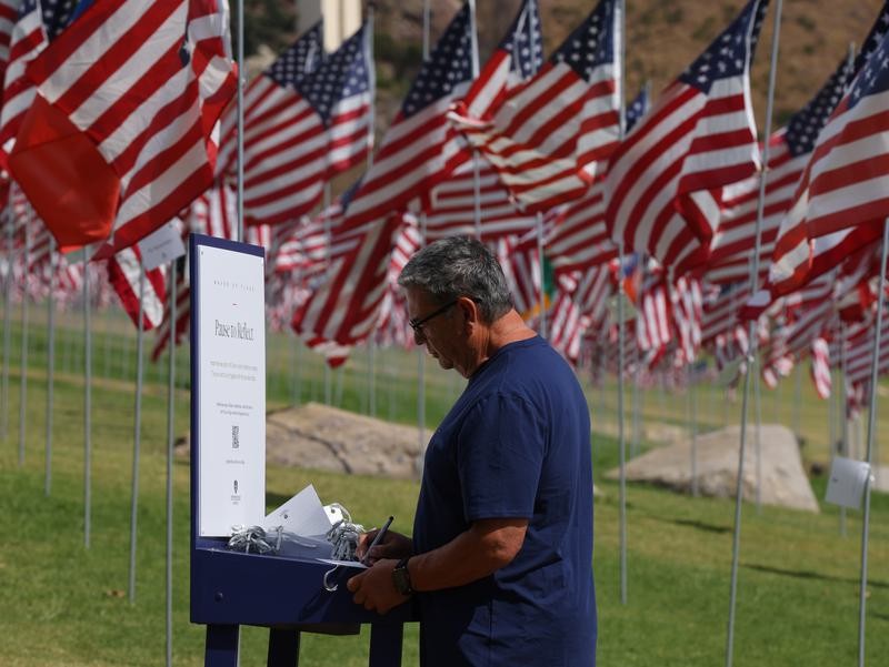 9月10日,在美國加利福尼亞州洛杉磯縣馬利布,人們從佩珀代因大學草坪上的“旗海”中走過。新華社照片 在紐約世貿中心遺址的儀式上,當地星期四(9月11日)上午8點46分,即被劫持客機撞向世貿中心北塔一刻,全市默哀,由當年死者的家屬宣讀遇難者名單。 市長亞當斯將前一日遭槍擊身亡的知名保守派活動人士查理柯克與911事件聯繫起來,指出正是同樣的仇恨驅使兩架飛機撞向世貿中心,亦讓一顆子彈射穿柯克的頸,暗殺事件刺痛美國人的內心。 特朗普當天在夫人梅拉尼亞陪同下出席911恐襲紀念儀式,兩人神情哀傷。特朗普發言時強調,在經歷磨難之後,美國會更強大。 特朗普指出:“作為一個國家,我們重申神聖的誓言,永不忘記2001年9月11日。我們在美國受到打擊,也絕不屈服;就算我們流血,也絕不低頭。” 特朗普夫婦又在弔唁冊上簽名,特朗普更寫上“我愛你們”。