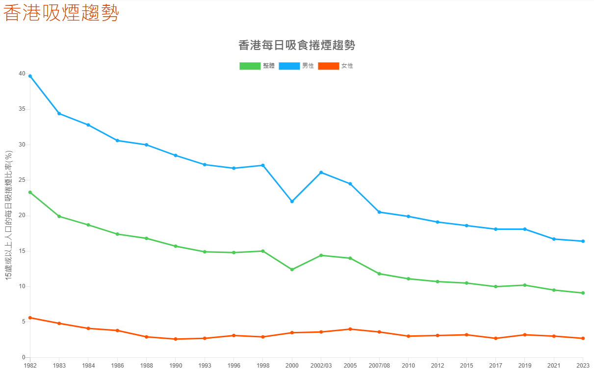 1982-2023年,香港吸煙率趨勢圖(圖源:香港吸煙與健康委員會) 不過,香港政府統計處數據顯示,現時香港約有58萬人仍有每日吸食傳統煙的習慣。這也就意味著不吸煙的市民難以完全避開“二手煙”。 但相信“條例草案”三讀的通過,會讓“無煙香港”的願景照進現實。(完) 【編輯:丘志彬】