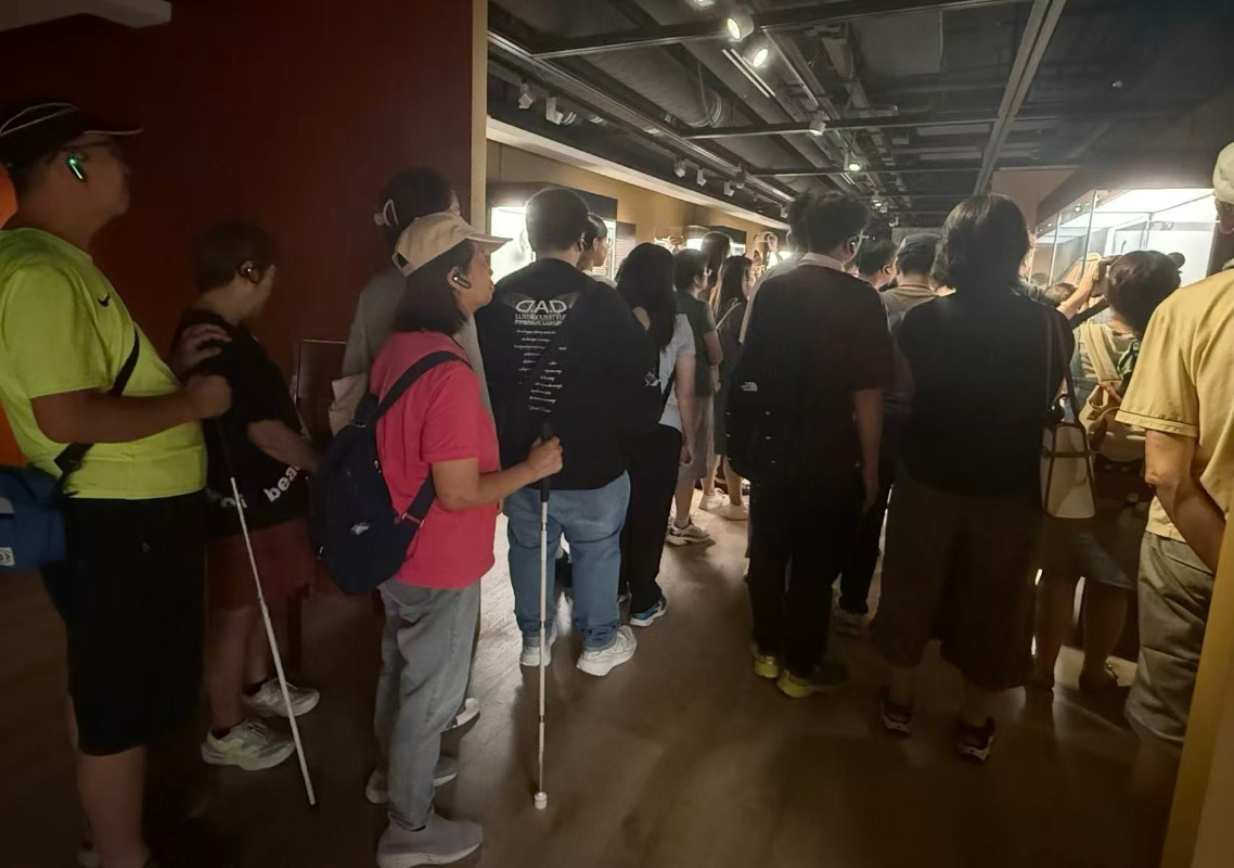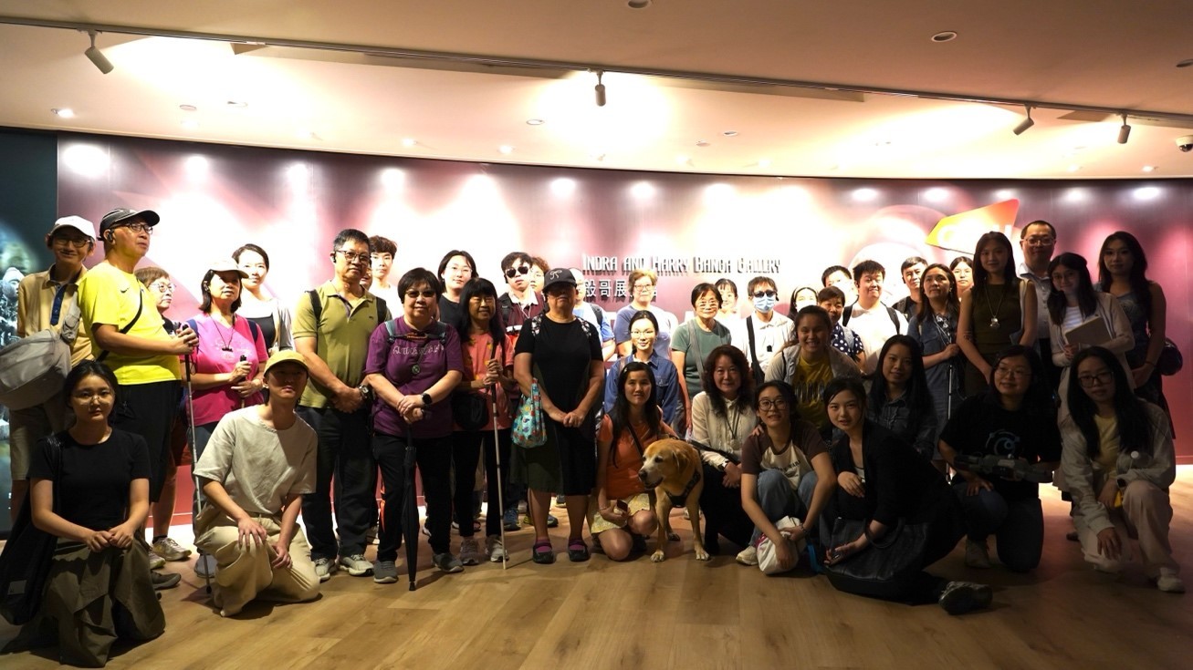 (香港城市大學翻譯及語言學系提供) 此次導賞團吸引了包括視障嘉賓與城大學生志願者在内超过50名參與者。學生志願者的加入,更進一步以實踐結合教育,進而提升學生的語言、翻譯和口述影像技能。 展覽館內,充滿神秘氣息的非洲面具被安置在玻璃展櫃內,一行約25位視障人士跟隨導賞員講解,進行一場“聽”的藝術賞析之旅。這場導賞,便是“口述影像”的實際應用,即通過口語描述,把“看見”的東西“說”出來。