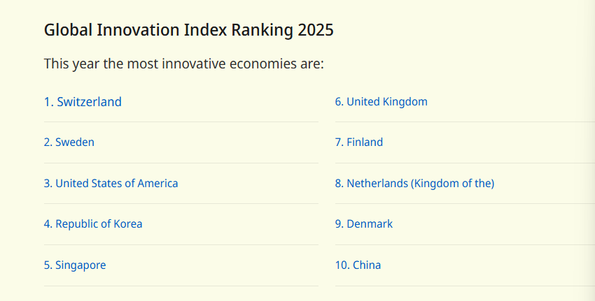 《2025年全球創新指數》發佈全球最具創新力國家前十排名。(圖源:WIPO) 這項“全球創新指數”(Global Innavation Index,GII)是WIPO基於78項指標,將全球139個經濟體的創新能力進行年度排名。自從2011年就取得全球創新龍頭的瑞士持續蟬聯冠軍,瑞典與美國則緊追其後,中國則是取代德國,首度取得全球排名第10的地位。GII顯示,隨著私營部門融資差距迅速縮小,中國有望成為最大的研發支出國。 調查顯示,全球創新前景因投資下滑而蒙上陰影。 專利擁有量被廣泛視為衡量一國經濟實力和工業技術水平的重要標誌。2024年,中國貢獻了約四分之一的國際專利申請,仍然是最大的申請國;而美國、日本和德國(合計占申請總量的40%)均略有下降。GII合作編輯Sacha Wunsch-Vincent表示,從長遠來看,德國不應對其跌至第11位感到擔憂,并補充說,新的排名并未反映美國特朗普政府征收關稅的影響。 世界知識產權組織(WIPO)總幹事鄧鴻森表示:“德國面臨的挑戰是...如何在數十年來作為真正強大的工業的強大地位的基礎上,成為數字創新的強國。” 榜單中第四至第九名的國家按順序為:韓國、新加坡、英國、芬蘭、荷蘭和丹麥。 (完) 【編輯:錢林霞】