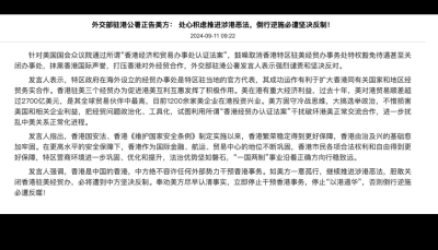 中國外交部駐港公署外景(新華社資料圖) 發言人表示,香港國安法和《維護國家安全條例》實施以來,香港繁榮穩定得到更好保障,香港由治及興的基礎愈加牢固。如今,香港蟬聯全球最自由經濟體榜首,世界競爭力排名重回全球三甲,世界人才排名躍居全球第四,均遠高於美國,香港作為投資興業樂土的吸引力不斷增強,“一國兩制”事業沿著正確方向行穩致遠。美國動輒揮舞關稅和制裁大棒,對國際投資貿易處處設限,對人才簽證收取高額費用,任意拘捕外企外國員工,根本沒有資格對香港營商環境說三道四。 發言人強調,美國在港有重大經濟利益,過去十年,美對港貿易順差超過2700億美元,是其全球貿易夥伴中最高,目前近1400家美企業在港投資興業。美方一再把經貿問題政治化、工具化,極力渲染外國企業在港營商所謂風險,嚴重干擾破壞港美正常交流合作,恰恰是香港營商環境的干擾者、破壞者。中方敦促美方切實尊重中國主權和香港法治,取消對港制裁,停止以任何方式干預香港事務和中國內政。(完) 【編輯:淩玉輝】
