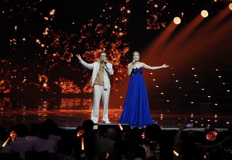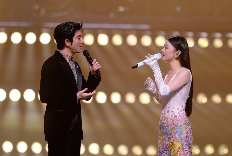 9月28日,王力宏(左)和單依純在演唱《落葉歸根》。圖片來源:新華社