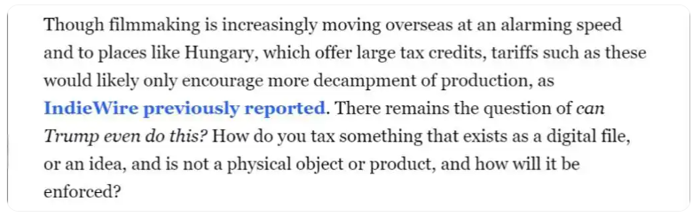 美國電影媒體IndieWire報道截圖 美國電影媒體IndieWire報道說,雖然美國電影製作正以驚人的速度轉移到海外,尤其是像匈牙利這樣提供大量稅收優惠的國家,但此類關稅只會進一步加劇電影製作外遷的趨勢。問題在於,要如何對一個以數字文件或創意形式存在的、而非實體產品的東西徵稅?又如何執行這項政策? 如果特朗普兌現這一威脅,這將標誌著他將首次對“服務”而非原材料等實物商品徵收關稅。 特朗普早在今年5月威脅對海外製作的電影徵收100%關稅,理由是其他國家提供稅收優惠,吸引電影人出走美國。在他最新的帖子中,他點名加利福尼亞州,稱該州“受到的打擊尤其嚴重”! 當特朗普在5月首次預告這一關稅政策時,好萊塢完全措手不及。一位業界人士當時表示:“乍一看,這令人震驚,幾乎等同於全面停止製作。但實際上,他沒有管轄權去這麼做,而且執行起來過於複雜。” 美國演員和導演通常更傾向於在家附近工作。但業內人士表示:“事實是,對好萊塢製片廠而言,給所有人買機票、付酒店錢都更便宜,因為海外的勞動力成本、更少的補貼限制以及生產條件,使得電影在海外製作的成本低得多。”