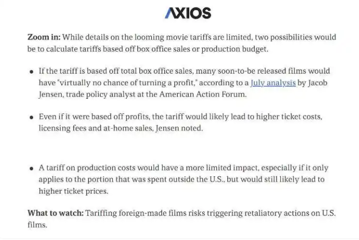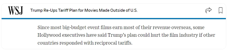 《華爾街日報》報道截圖 由於美國許多大製作電影的大部分收入來自海外,《華爾街日報》援引一些好萊塢高管的觀點報道指出,如果其他國家以“對等關稅”作為回應,這一關稅計劃可能會損害美國電影業。 多位製片廠高管今年早些時候表示,他們對如何執行電影關稅“感到困惑”,因為現代影片通常在多個國家分散進行製作、融資、後期與視效。 美國阿克西奧斯新聞網分析說,雖然目前關於電影關稅如何實施披露出的細節有限,但有兩種可能的徵收方式:根據票房收入或製作成本計算關稅。報道援引美國政策研究機構“美國行動論壇”貿易政策分析師雅各布·詹森的一份報告指出,如果關稅基於總票房收入計算,許多即將上映的影片“幾乎沒有盈利的希望”。即使關稅基於利潤計算,也可能導致電影票價、版權費和家庭影音產品價格上漲。而以製作成本為基礎徵收關稅的影響可能較小,尤其如果只針對在美國境外支出的部分,但仍然可能導致電影票價上漲。報道還指出,對在美國海外製作的影片徵收關稅可能會引發其他國家對美國影片的反制措施。