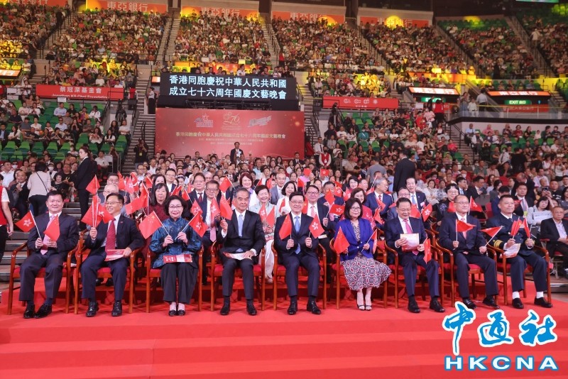 香港紅館歡歌賀國慶:全運主題曲壓軸、機器人助興香港中通社10月2日電(香港中通社記者 張明臻)紫荊花開,香滿神州。10月2日晚,一場融合AI機器人、全運會、經典電影等元素的文藝晚會,在香港體育館上演,表達香港對祖國76周年華誕的美好祝願。 晚會由香港同胞慶祝中華人民共和國成立76周年籌備委員會主辦。當日,全國政協副主席梁振英、香港特區行政長官李家超、中聯辦副主任尹宗華、外交部駐港公署特派員崔建春、駐港國家安全公署副署長陳楓、解放軍駐港部隊參謀長魏德明少將、前行政長官林鄭月娥、以及一眾香港特區官員出席。