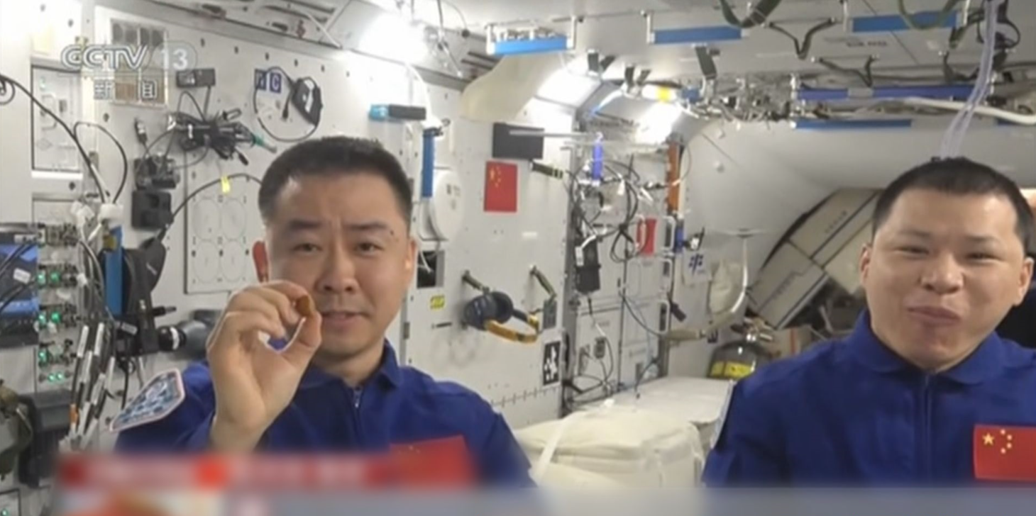 圖源:央視新聞報道截圖。 “太空家園”裡的團圓儀式 “我們在中國空間站,祝大家中秋快樂!願闔家團團圓圓、身體健健康康、生活和和美美!”清晨,隨著神舟二十號乘組的聲音透過天地鏈路傳回地面,這場跨越星辰的中秋問候正式開啟。儘管身處失重環境,三位航天員特意穿上印有“中秋快樂”字樣的航天服,以空間站為背景錄製祝福視頻,鏡頭掃過艙內懸掛的中國結與“福”字,滿滿家國情懷。 太空菜園的“秋收小景” 作為中秋當日的首項工作,航天員們搶在“月圓時刻”前來到太空菜園,為種植的薄荷、生菜等作物澆水。陳中瑞操縱著微型噴霧器,笑著向地面報告:“去除老葉後,新葉長得更旺了!您瞧這盆薄荷,竟在太空開出了小白花,太治愈了!”這片不足2平方米的菜園,不僅是航天員的“太空農場”,更承載著他們對地球生態的親密聯結——此前的薄荷、小麥等作物已成功完成多輪生長實驗,為未來長期駐留的食品自給積累數據。 地面團隊的“中秋加餸”:細節裡的溫暖 “今天的加餐特別豐盛!”王杰舉著擺滿餐盒的托盤介紹,地面團隊早早就為他們備下“中秋限定菜单”:白靈菇燉雞湯鮮香濃郁,油燜筍脆嫩爽口,黃金卷(豆腐卷)、肉末香菇、蝦球馬蹄等熱菜依次擺開,還有素米粉、太空香糭、桂花芝士年糕等點心。最讓人期待的是月餅——陳冬拆開包裝,與隊友分享豆沙餡月餅:“地面同事太貼心了,這味道和家裡一樣!”鏡頭外,地面控制中心的屏幕上,“祝航天員中秋快樂”的字幕滾動不斷,兩地同心共慶佳節的畫面溫暖人心。