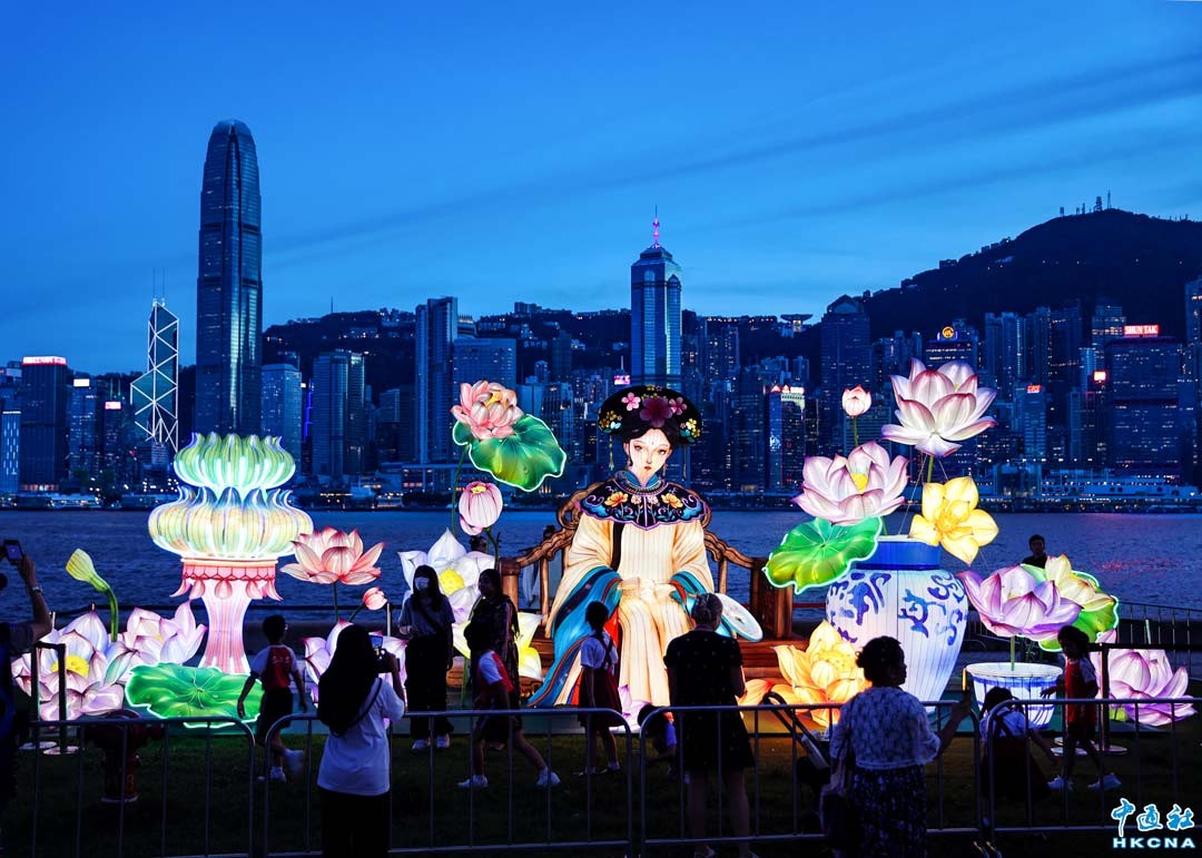 “迎國慶·香港華服嘉年華”9月29日起至10月2日在西九文化區的海濱亮相。活動將國家級非遺自貢花燈技藝和華服文化融合創新,主燈"紫霞仙子"高12.8米,乃目前香港展出的最大單體人物花燈。花燈展由4個大型花燈組成,沿維港海岸線陳列,形成獨特的城市風景。(香港中通社記者 徐文峰攝)