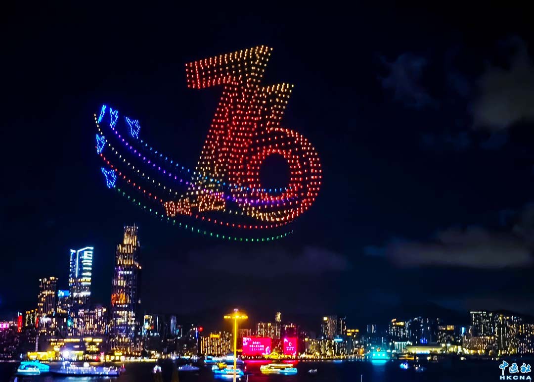 10月2日晚上8時,1200架無人機群騰空而起,點亮灣仔海濱。由紫荊文化集團主辦、紫荊雜誌社承辦的2025年國慶無人機表演準時啟幕。本次表演以“慶祝中華人民共和國成立76周年”為主題,通過“科技+文化+藝術”的呈現形式,將香港與祖國密切相關的重大工程和盛事通過不斷變幻的圖案串連,通過15幕共計15分鐘的表演為香港市民帶來一場沉浸式的視聽體驗。 (香港中通社記者 洪少葵攝)