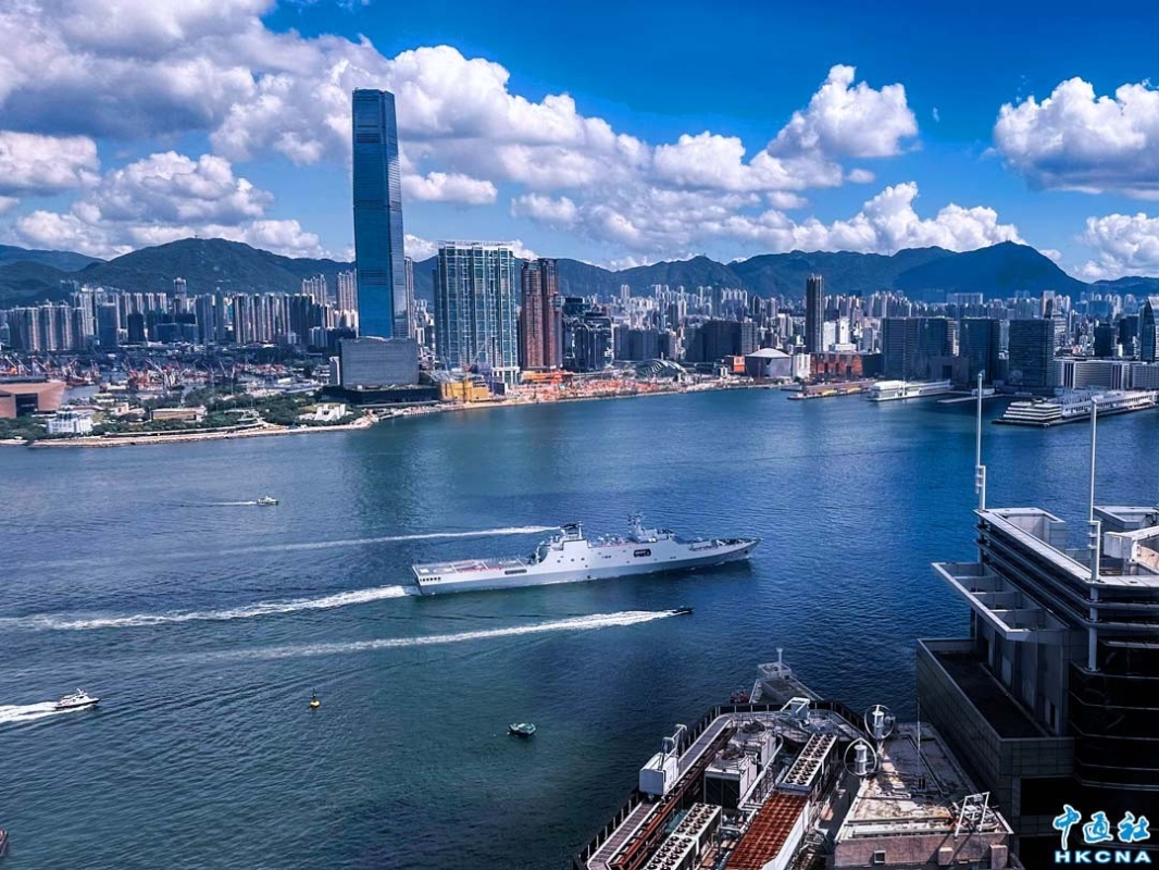 10月3日上午9時,海軍戚繼光艦、沂蒙山艦編隊已完成出航前的各項準備工作離開香港。由海軍戚繼光艦、沂蒙山艦組成的83艦編隊來港期間,於昂船洲軍營舉辦艦艇開放活動,吸引大量香港市民到場參與。圖為沂蒙山艦離開香港。(香港中通社記者 張明臻攝)