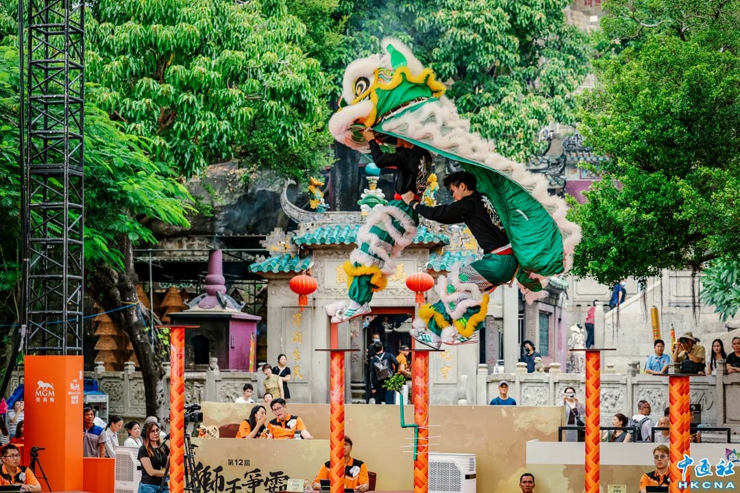 10月4日,作為本年度美高梅獅王爭霸系列活動的壓軸盛事,第十二屆 “獅王爭霸國際賽 2025 — 美高梅盃”在世遺地標媽閣廟前地隆重舉行。今屆 賽事共吸引來自13個國家及地區的21支勁旅、近260名運動員參與角逐,爭奪南獅規定樁 陣自選套路(高樁)、女子傳統南獅賽、青少年傳統南獅賽和兒童組傳統南獅賽四大項目桂冠。 香港中通社圖片