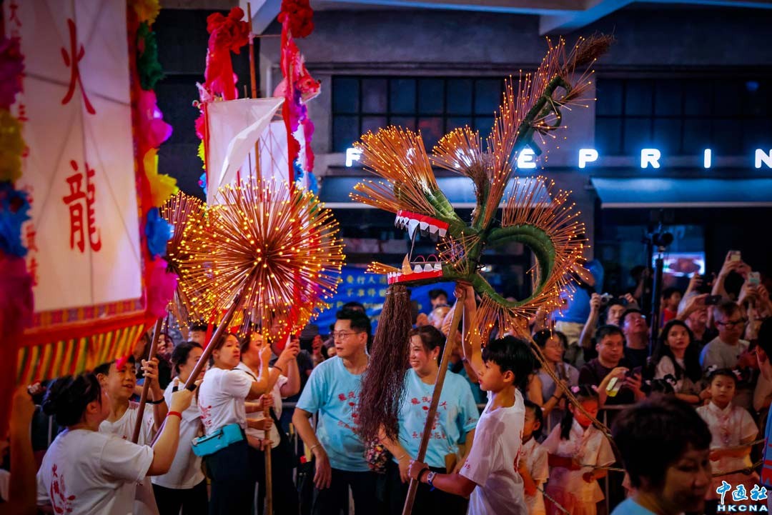 10月5日,香港一年一度的中秋節大坑舞火龍今晚迎月夜起一連三晚舉行。全長67米的火龍插上過萬支長壽香,由300多人舞動,穿梭大坑的大街小巷,吸引大批市民和遊客到場觀看。火龍舞動引起陣陣歡呼,氣氛熱閙。(香港中通社記者 謝光磊攝)