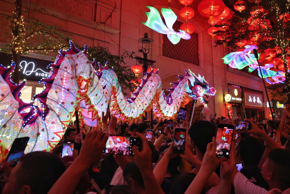 長18米的“幻彩夜光火龍”在利東街林蔭大道穿梭。