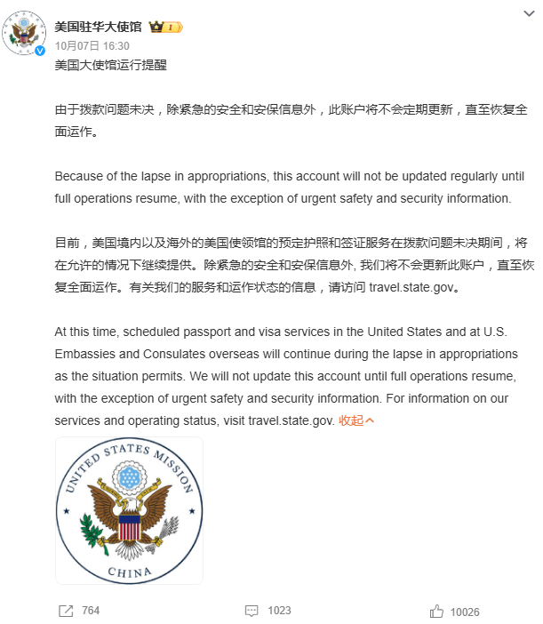 (美國駐華大使館微博截圖) 綜合8日消息,此次調整與美國聯邦政府“停擺”直接相關。當地時間10月1日0時,美國聯邦政府因兩黨在醫保福利等議題上未能就臨時撥款法案達成一致,時隔近七年再度陷入停擺。數十萬聯邦僱員面臨無薪休假,部分公共服務被迫暫停或延遲,多項經濟數據發布亦受影響。 受此波及,美國駐外使領館的非緊急運營受到限制。早在10月3日,美國駐華使領館已在社交平台X發布公告,稱除緊急信息外,將暫停賬號更新。事實上,其微博賬號自9月30日發布美國國務卿魯比奧祝賀中國國慶的聲明後,已連續多日未更新內容。 儘管社交媒體運營受限,美國駐華使領館在公告中強調,包括護照與簽證在內的預定服務將在現有資源允許的情況下繼續提供,以保障基本領事功能運轉。這一安排與美國境內及其他海外使領館的應對措施保持一致。 美國政府停擺源於國會兩黨長期的政治僵局,直接影響全球範圍內的外交機構運作。有分析指,此次駐華使領館暫停社交媒體更新,是美國政府非核心職能收縮的體現。未來何時恢復更新,將取決於美國國會能否盡快通過撥款法案,結束當前財政困境。(完) 【編輯:淩玉輝】