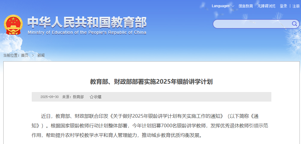 香港中通社10月8日電 近日,中國教育部、財政部發布《關於做好2025年銀齡講學計劃有關實施工作的通知》,計劃在2025年義務教育階段招募7000名講學教師,旨在充分利用退休教師專業優勢、經驗優勢,加強鄉村教師隊伍建設。
