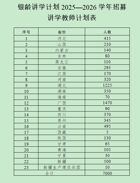 圖為“銀齡講學計劃2025—2026學年招募講學教師計劃表” 圖源:中國教育部 中國官方為該計劃提供經費保障。講學教師服務期間人事關係、現享受的退休待遇不變。按月發放工作經費,主要用於向講學教師發放工作補助、交通差旅費用及購買意外保險費等。義務教育階段講學教師工作經費由中央財政和地方財政按照年人均2萬元人民幣標準共同分擔。受援縣為講學教師提供周轉宿舍,配備必要的生活設施。 近日,中國浙江省、甘肅省也發布了銀齡教師招募的具體要求和信息。(完) 【編輯:彭玉婷】