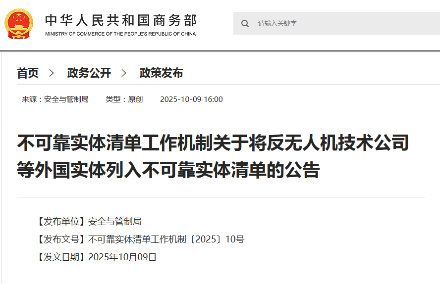 中國商務部網站截圖 據中國商務部官網消息,發言人表示,近年來,反無人機技術公司、TechInsights公司及其分支機構等外國實體不顧中方強烈反對,分別與台開展所謂軍事技術合作、發表涉華惡劣言論、協助外國政府打壓中國企業,嚴重損害中國國家主權、安全和發展利益。中方根據《中華人民共和國對外貿易法》、《中華人民共和國國家安全法》、《中華人民共和國反外國制裁法》等法律,依據《不可靠實體清單規定》第二條等規定,依法追究其不法責任。 發言人指出,中方一貫審慎處理不可靠實體清單問題,僅依法針對極少數危害中國國家安全的外國實體,誠信守法的外國實體完全無需擔心。中國政府一如既往地歡迎世界各國企業來華投資興業,並致力於為守法合規的外資企業在華經營提供穩定、公平和可預期的營商環境。 據公告,涉及的外國實體包括:反無人機技術公司(Dedrone by Axon)、迪傑恩技術公司(DZYNE Technologies)、埃比特系統美國分公司(Elbit Systems of America, LLC)、伊比魯斯公司(Epirus, Inc.)、TechInsights公司及其分支機構等。該清單自公布之日(9日)起實施。(完) 【編輯:淩玉輝】
