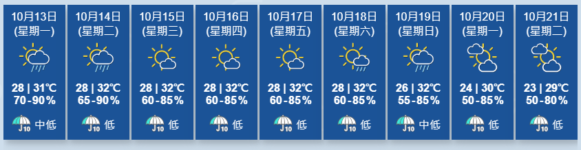 香港新聞網10月12日電 從艶陽高照到突降大雨,香港的天氣說變就變。香港天文台指過去兩三小時,本港多處地區錄得約10毫米雨量。本港地區下午及今晚天氣預測大致多雲,有幾陣驟雨。未來一兩日仍有幾陣驟雨,短暫時間有陽光。本週中至後期大致天晴及炎熱。 據香港天文台今天上午11:45的最新預報,與廣闊低壓槽相關的驟雨及雷暴正影響廣東沿岸及南海北部。在正午十二時,強烈熱帶風暴娜基莉集結在東京之西南約760公里,預料向東北偏東移動,時速約26公里,橫過日本以南海域。過去兩三小時,本港多處地區錄得約10毫米雨量。 本港地區下午及今晚天氣預測大致多雲,有幾陣驟雨,初時部分地區雨勢較大及有雷暴。吹和緩偏東風。