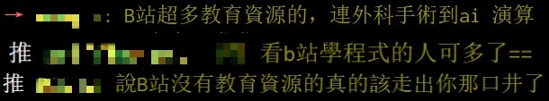 台灣網友們也給出了答案:“B站學習資源豐富耶!”“B站上的微積分、物理、編程語言教的蠻好的!”“B站超多教育資源的,從外科手術到AI演算……”“我都看B站學古文!”還有台灣網友直言,“說B站沒有教育資源的真的該走出你那口井了。”