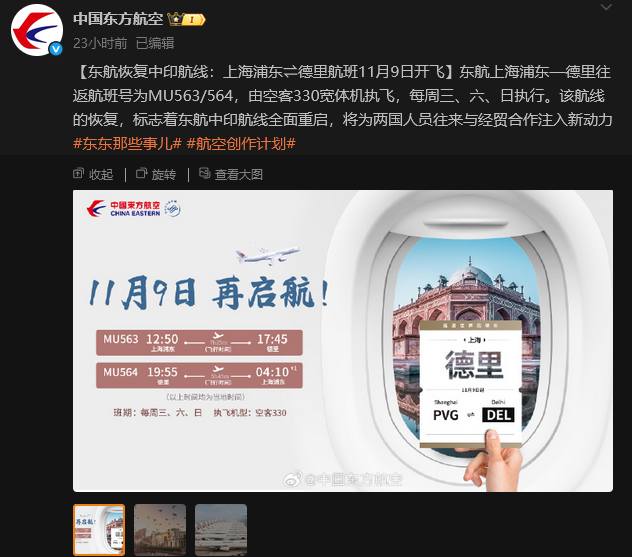 圖源:“中國東方航空”微博截圖 此前,印度駐華大使館在“十·一”假期期間表示,雙方已達成共識,2025年10月底前可恢復兩國間指定通航點的直飛航班。 東航在微博上發布的消息顯示,上海浦東—德里航班11月9日開飛,往返航班號為MU563/564,由空客330寬體機執飛,每周三、六、日執行。 據介紹,上海浦東—德里的去程航班號為MU563,12:50從上海浦東機場起飛,當地時間17:45抵達德里英迪拉·甘地國際機場;回程航班號為MU564,德里19:55起飛,次日4:10抵達上海浦東(以上時間均為當地時間)。目前,該航線的機票已開放銷售。 另外,印度最大的航空公司靛藍航空日前宣布,10月26日起開通印度加爾各答至廣州的每日直飛航班。(完) 【編輯:彭玉婷】