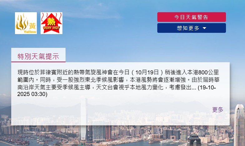 香港新聞網10月19日電 香港天文台表示,現時位於菲律賓附近的熱帶氣旋“風神”會在今日(19日)稍後進入香港800公里範圍內。同時,受一股強烈東北季候風影響,香港風勢將會逐漸增強。由於屆時華南沿岸天氣主要受季候風主導,天文台會視乎香港風力變化,考慮發出強烈季候風信號。