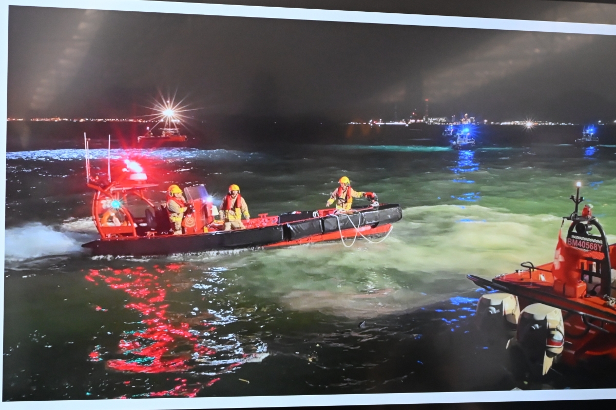 消防處助理處長於文陽表示, 消防動用超過200名消防及救護人員,調派45輛消防車及24輛救護車等設備,消防員在水底搜索到巡邏車。 2名死者分別是41歲的保安巡邏車司機及30歲保安員。