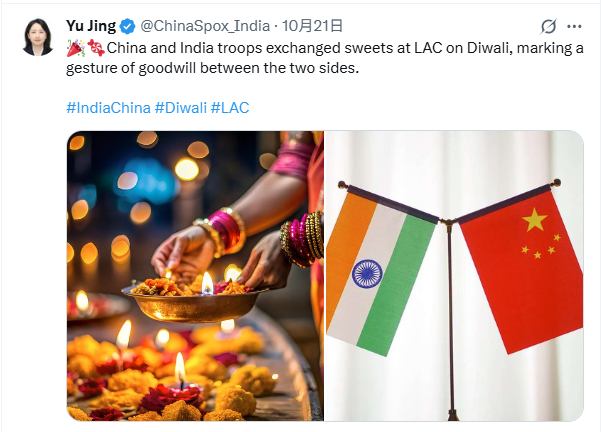 圖片來源:中國駐印度大使館發言人X帳號 21日,中國駐印度大使館發言人在社交平台X上發文稱,交換糖果這一姿態“展現了雙方善意”。印度軍方消息人士也證實,兩軍在實控線沿線的所有傳統邊境點交換了糖果。一名消息人士稱:“這是與中方開展互動的常規舉措,旨在維護邊境地區和平與安寧。”據報道,中印兩軍每逢重要節日互贈糖果的傳統,因2020年加勒萬河穀衝突一度中斷,直到去年排燈節才恢復。 過去一年,中印外交與安全對話持續推進。今年7月,中印共同主持中印邊境事務磋商和協調工作機制第34次會議,雙方積極評價去年以來邊境局勢管控取得的進展,同意保持外交軍事渠道溝通,共同維護邊境地區和平安寧。8月,中印邊界問題特別代表第24次會晤在新德里舉行,雙方就中印邊界問題坦誠、深入交換意見,并達成10點共識。雙方重申維護邊境地區和平安寧的重要性,強調通過友好協商妥處有關問題,以促進中印關係整體發展。雙方還同意在中印邊境事務磋商和協調工作機制框架下設立劃界專家小組,探討在條件成熟的地段推進劃界談判。 (完) 【編輯:紀東】