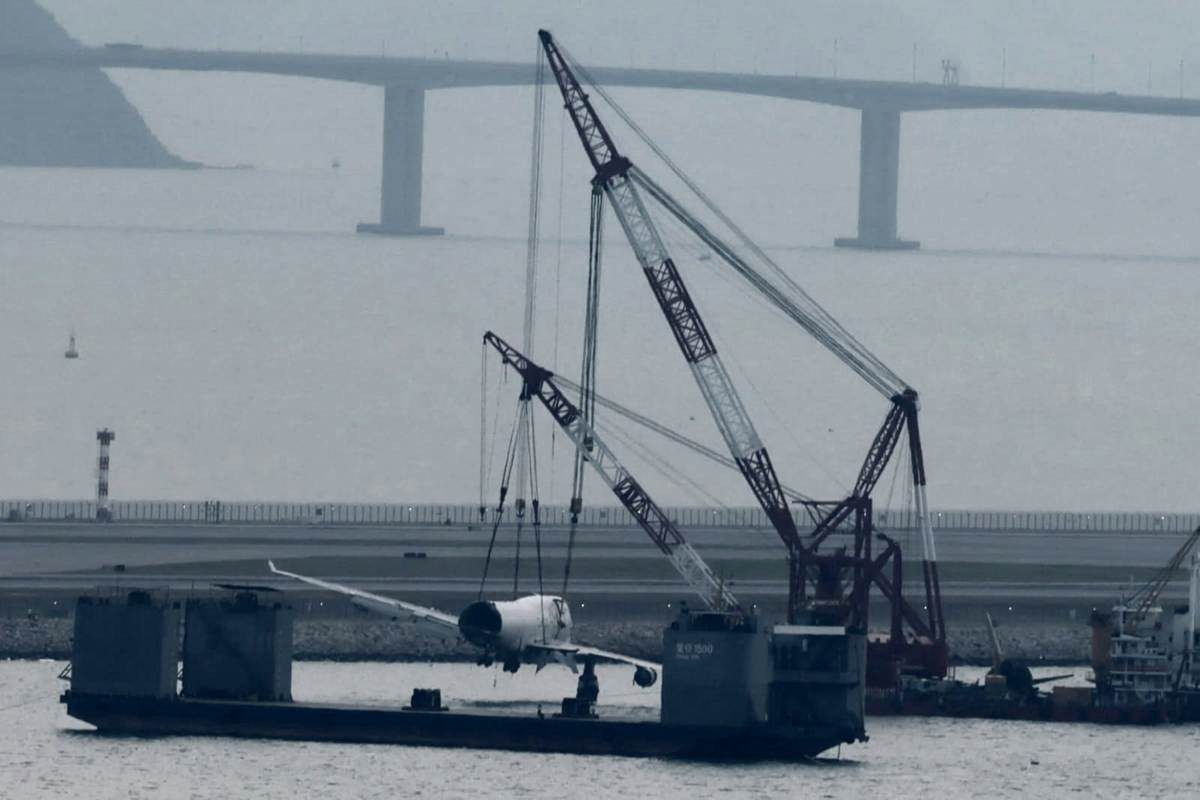 香港中通社10月26日電 一架由阿聯酋抵港的B744貨機20日在香港國際機場北跑道降落後偏離並滑落海面。打撈貨機殘骸工作26日進入第四日,兩艘打撈船“南天翔”和“南天鵬”中午過後開始從海中吊起最大件的機身連機頭。 26日早約9時,打撈團隊的專業打撈船及拖船“穗救拖18”,再吊起貨機的部分機身殘骸放在躉船上。隨後工程人員用鋼索從四邊固定擱在跑道對出防波堤海中最大的一件殘骸,即貨機的機身連機頭部分。至下午約1時半,打撈船的吊機緩慢將整件殘骸吊起,可見左邊機翼逐漸離開水面。屬廣州打撈局的另一艘拖船“德鵬”,以及用作承載超大物件的半潛船“重任1500”亦遂步移近北跑道。
