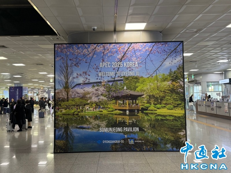 韓國慶州進入“APEC時間” 香港中通社圖片 中通社記者27日從釜山機場入境,再乘大巴轉到慶州古老街巷,隨處可見APEC歡迎標識與會議海報。權志龍、李在明為主角的宣傳視頻在市面各處滾動播放,韓國娛樂文化特色與濃鬱的國際盛會氛圍結合,向來自環太平洋地區代表與遊客展示東道主的熱情。 記者抵達釜山機場時便感受到撲面而來的辦會氣氛。各式以慶州歷史古跡為背景的APEC宣傳海報,鋪滿機場立柱,寫著“歡迎來到韓國慶州APEC 2025”。身著韓服的志願者接待員們,提著燈籠笑臉盈盈在門外守侯。