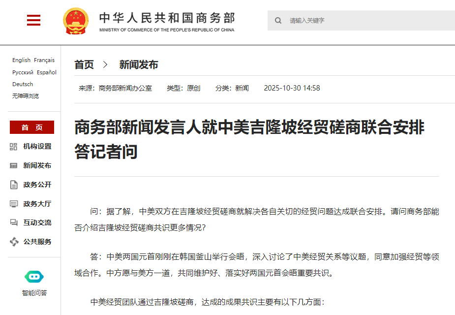 中國商務部官網截圖 據中國商務部官網消息,發言人表示,中美兩國元首剛剛在韓國釜山舉行會晤,深入討論了中美經貿關係等議題,同意加強經貿等領域合作。中方願與美方一道,共同維護好、落實好兩國元首會晤重要共識。 中美經貿團隊通過吉隆坡磋商,達成的成果共識主要有以下幾方面: 一、美方將取消針對中國商品(包括香港特別行政區和澳門特別行政區商品)加徵的10%所謂“芬太尼關稅”,對中國商品(包括香港特別行政區和澳門特別行政區商品)加徵的24%對等關稅將繼續暫停一年。中方將相應調整針對美方上述關稅的反制措施。雙方同意繼續延長部分關稅排除措施。 二、美方將暫停實施其9月29日公布的出口管制50%穿透性規則一年。中方將暫停實施10月9日公布的相關出口管制等措施一年,並將研究細化具體方案。 三、美方將暫停實施其對華海事、物流和造船業301調查措施一年。美方暫停實施相關措施後,中方也將相應暫停實施針對美方的反制措施一年。 此外,雙方還就芬太尼禁毒合作、擴大農產品貿易、相關企業個案處理等問題達成共識。雙方進一步確認了馬德里經貿磋商成果,美方在投資等領域作出積極承諾,中方將與美方妥善解決TikTok相關問題。 發言人說,中美吉隆坡經貿磋商取得積極成果,充分證明雙方秉持平等、尊重和互惠的精神,通過開展對話與合作,能找到解決問題的辦法。經貿磋商成果來之不易,中方期待與美方共同做好落實工作,為中美經貿合作與世界經濟注入更多確定性和穩定性。(完) 【編輯:石歡歡】
