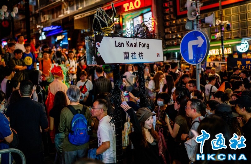 香港中通社10月31日電 10月31日晚是萬聖夜,香港不少市民遊客穿上奇裝異服,到中環蘭桂坊過節,現場人潮湧湧。