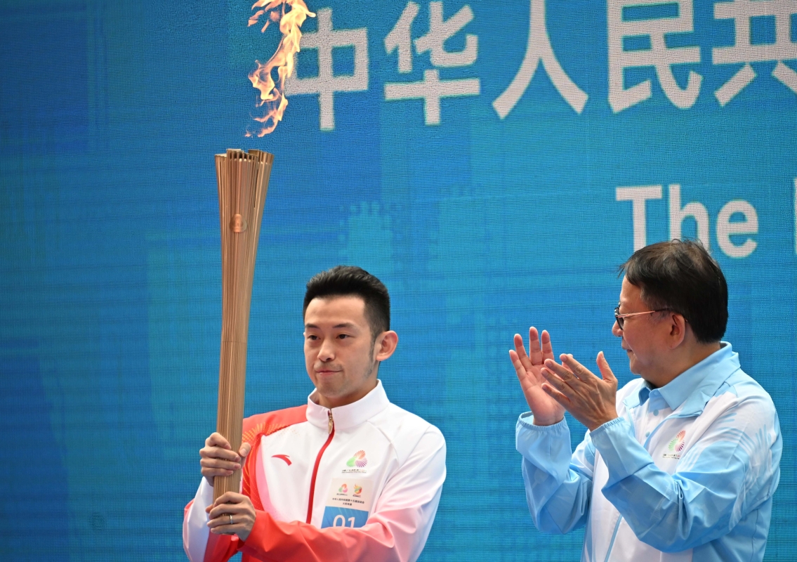 署理行政長官陳國基(右)將火炬交予第一棒的火炬手港隊男子乒乓代表黃鎮廷並宣布火炬傳遞開始。