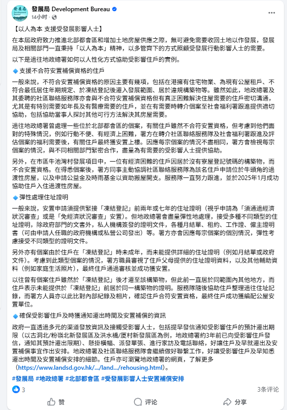 香港新聞網11月5日電  香港發展局4日於社交媒體發文表示,在本屆政府致力推進北部都會區和增加土地房屋供應之際,無可避免需要收回土地以作發展,局方及相關部門一直秉持“以人為本”精神,以多管齊下的方式照顧受發展行動影響人士的需要。