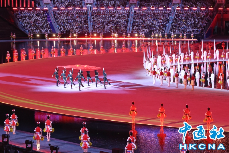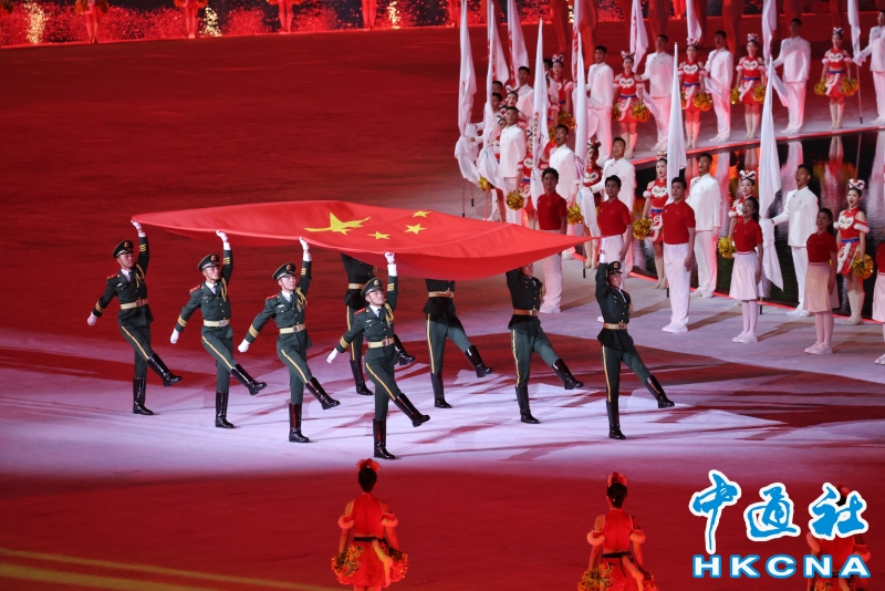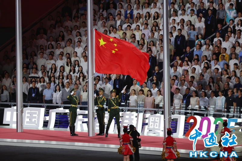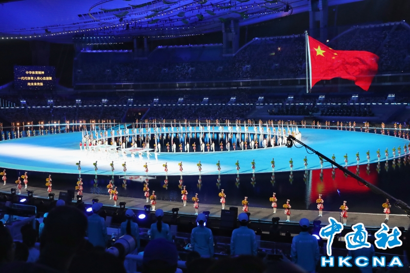 11月9日,中華人民共和國第十五屆運動會開幕式在廣東奧林匹克體育中心舉行。以“圓夢未來”為主題的開幕式包括“同根同源、同心同緣、同夢同圓”三個篇章,展現粵港澳大灣區的壯闊圖景。圖為旗手升起中華人民共和國國旗。(香港中通社記者 謝光磊 攝) 香港中通社圖片