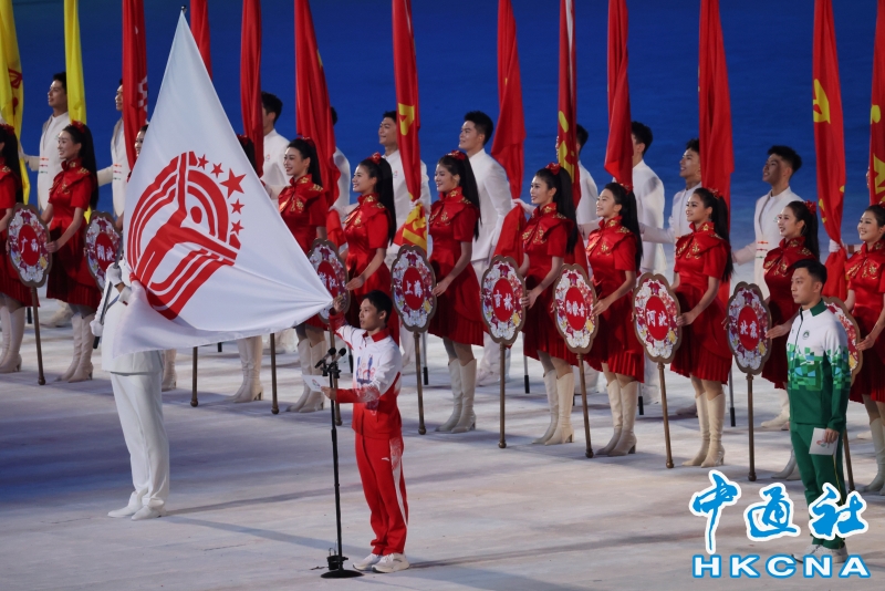 11月9日,中華人民共和國第十五屆運動會開幕式在廣東奧林匹克體育中心舉行。以“圓夢未來”為主題的開幕式包括“同根同源、同心同緣、同夢同圓”三個篇章,展現粵港澳大灣區的壯闊圖景。圖為旗手護送中華人民共和國運動會會旗和第十五屆全國運動會會旗入場。(香港中通社記者 謝光磊 攝) 香港中通社圖片