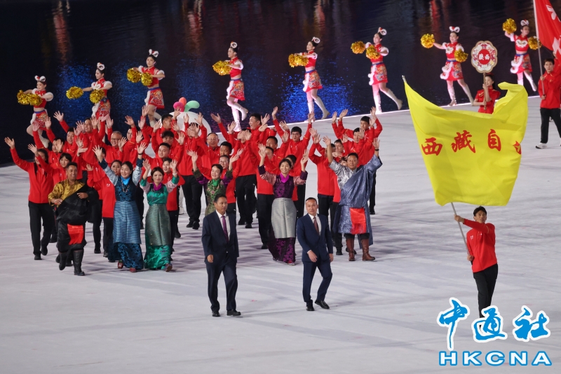 11月9日,中華人民共和國第十五屆運動會開幕式在廣東奧林匹克體育中心舉行。以“圓夢未來”為主題的開幕式包括“同根同源、同心同緣、同夢同圓”三個篇章,展現粵港澳大灣區的壯闊圖景。圖為西藏自治區體育代表團入場。(香港中通社記者 謝光磊 攝) 香港中通社圖片
