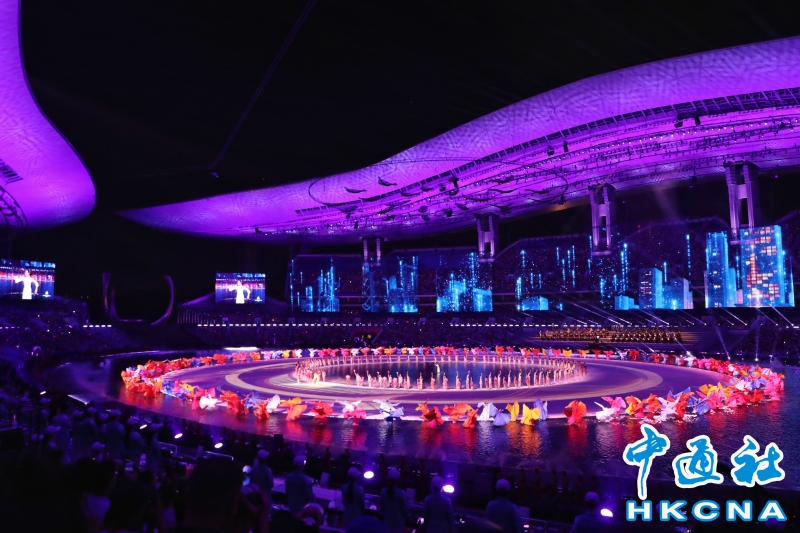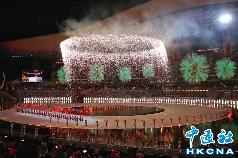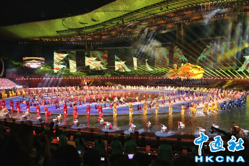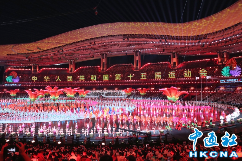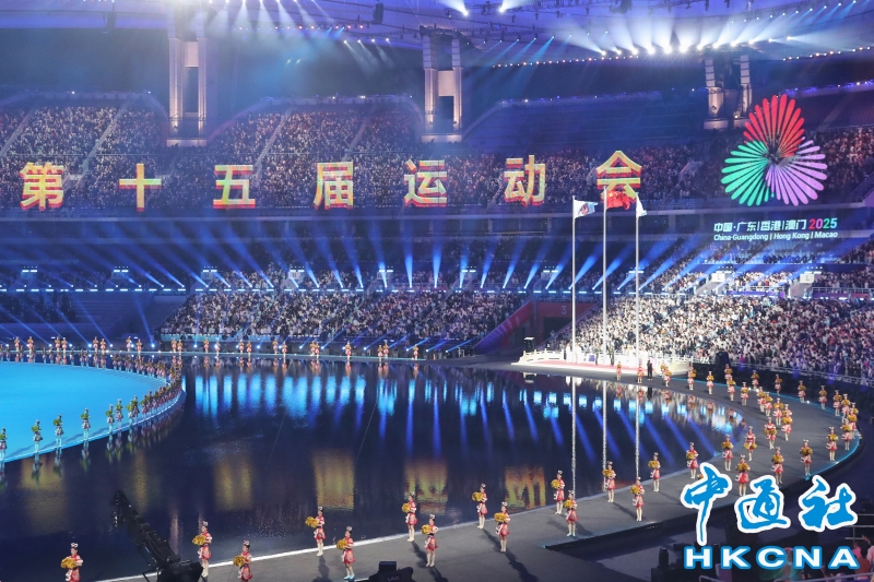 11月9日,中華人民共和國第十五屆運動會開幕式在廣東奧林匹克體育中心舉行。以“圓夢未來”為主題的開幕式包括“同根同源、同心同緣、同夢同圓”三個篇章,展現粵港澳大灣區的壯闊圖景。(香港中通社記者 謝光磊 攝) 香港中通社圖片